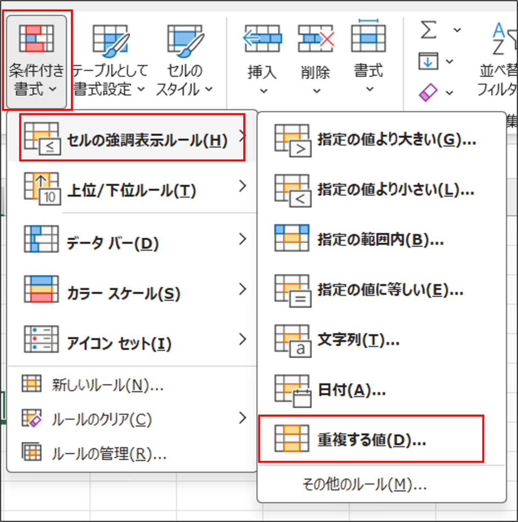 3. 「セルの強調表示ルール」→「重複する値」を選択