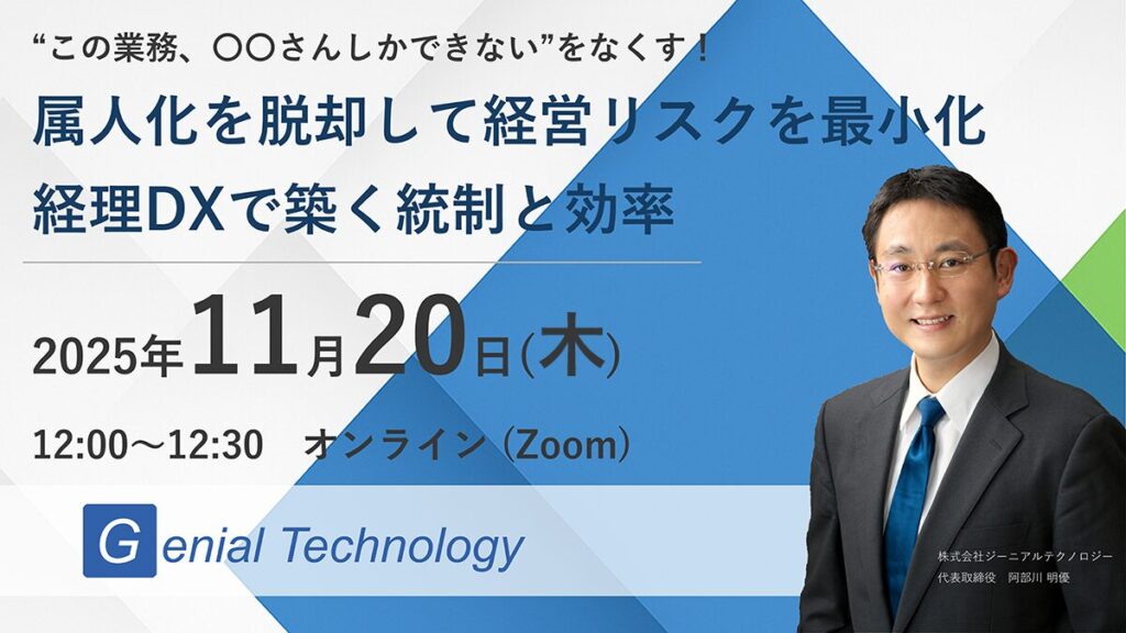 株式会社ジーニアルテクノロジーは、「“この業務、〇〇さんしかできない”をなくす!属人化を脱却して経営リスクを最小化―経理DXで築く統制と効率」と題した無料オンラインセミナーを開催いたします。